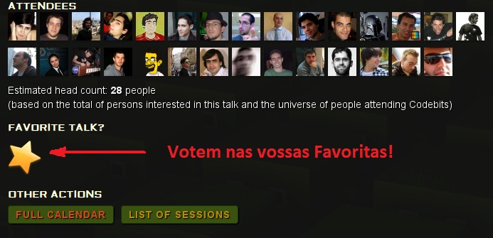 Pede-se a todos os participantes que marquem como favoritas as apresentações que mais vos interessarem, desta forma dando uma ideia mais precisa do tipo de afluência que cada talk terá, e assim facilitando a determinação do palco mais apropriado.