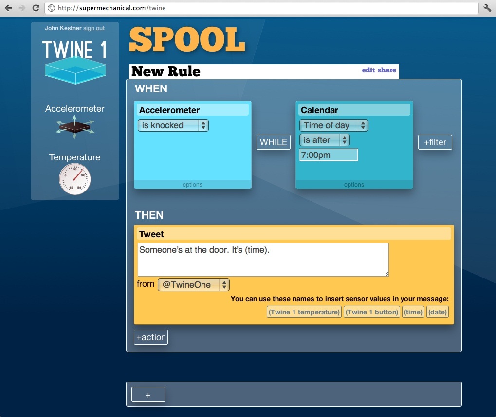 É isso mesmo que pretendem fazer os responsáveis por este Twine; pequenos módulos "sensoriais", com sensores de movimento, temperatura, e outros - e que podem facilmente ser utilizados e ligados à Internet, através de interfaces simples, para despoletar um sem número de operações: como por exemplo, enviar um tweet sempre que a temperatura exceda um certo limite, ou se alguém o abanar.