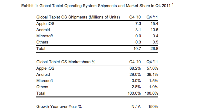 A Apple pode sentir-se confortável com a liderança do iPad no mercado dos tablets, e até se dar ao luxo de dizer que apenas se tem que preocupar com isso quando "existir concorrência"... Mas de acordo com estes números, os tablets Android já detêm 39% do mercado.