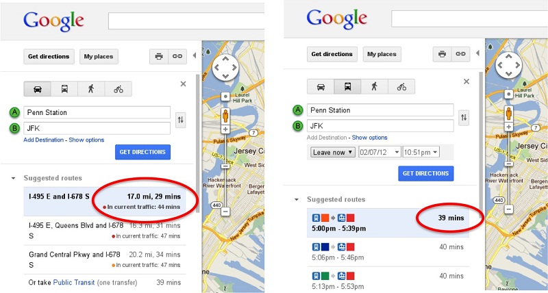 Nos locais onde esta informação estiver disponível, o Google Maps passa a indicar a estimativa da duração da vossa viagem em função das condições de trânsito - e permite assim ver que uma viagem que normalmente demoraria 15 minutos pode afinal demorar o dobro do tempo; e que provavelmente chegarão mais rápidos usando um transporte público alternativo, como o metro, etc.