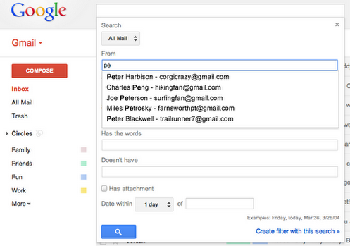 Quando clicam nas pesquisas avançadas - expandindo a caixa de pesquisa - o Gmail irá tentar fazer o auto-complete inteliguente daquilo que estão a escrever no From: e To: facilitando a introdução dos emails das pessoas que procuram.