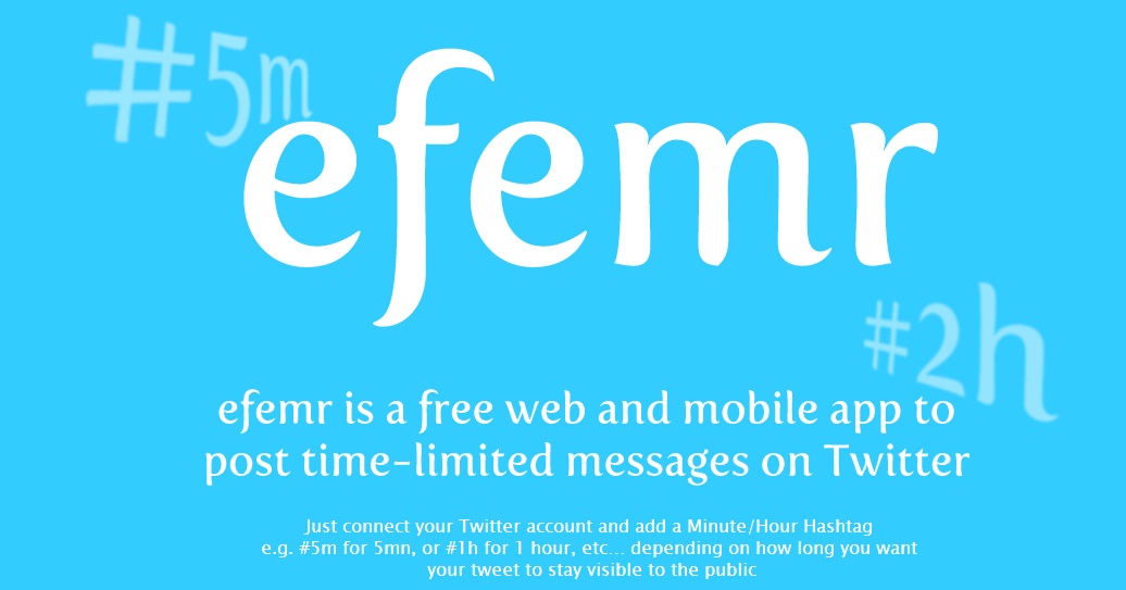 Hoje em dia é fácil dizer-se algo na Internet que depois nos venhamos a arrepender. Para tentar minimizar essa situação, ou tão somente para divulgarem algo que apenas faz sentido durante um período específico de tempo (por exemplo: dizerem que durante a próxima hora está a ocorrer uma promoção em tal sítio... e não quererem lidar com pessoas que horas depois vos perguntem onde, como, e porque razão já não encontram isso), surge este efemr.