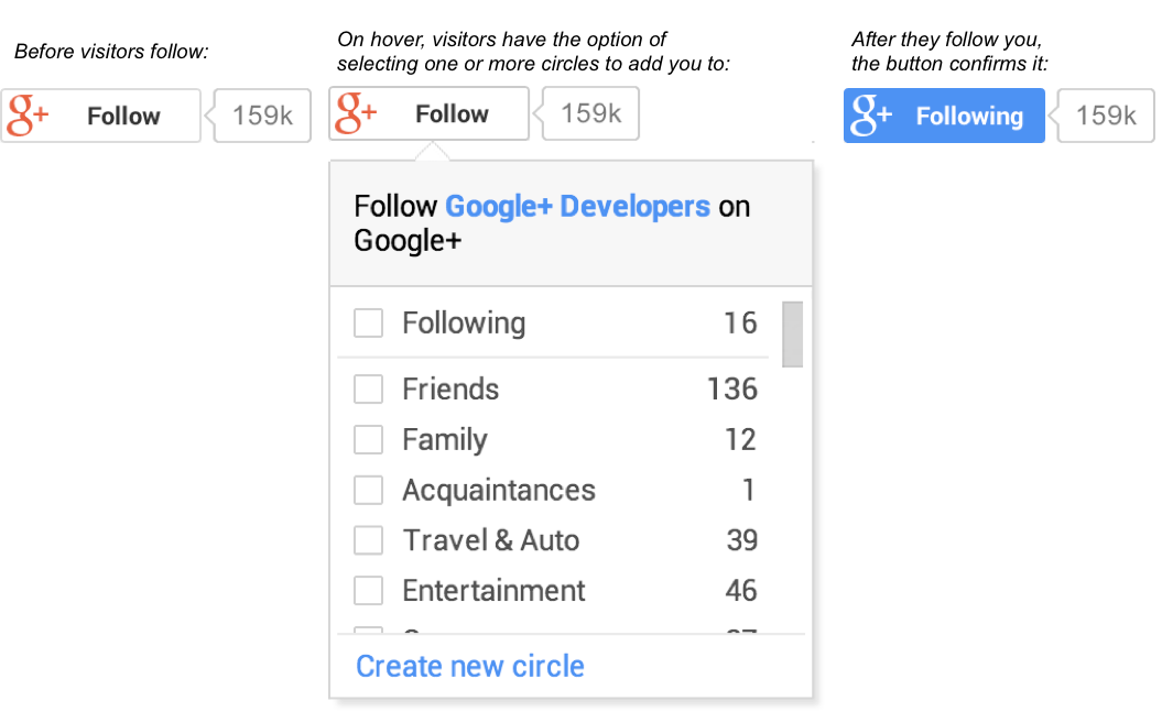 O habitual botão do G+ dá agora lugar a um botão de follow que permite seleccionar logo em que círculo desejamos colocar o novo site/pessoa a seguir. (Eu até que actualizava os que tenho ali ao lado - mas, por algum motivo, ainda não os consegui colocar a funcionar... e o tempo não é muito para andar a desperdiça-lo a tentar fazer debug de coisas que deviam funcionar à primeira. :P