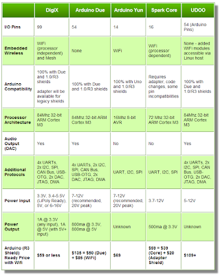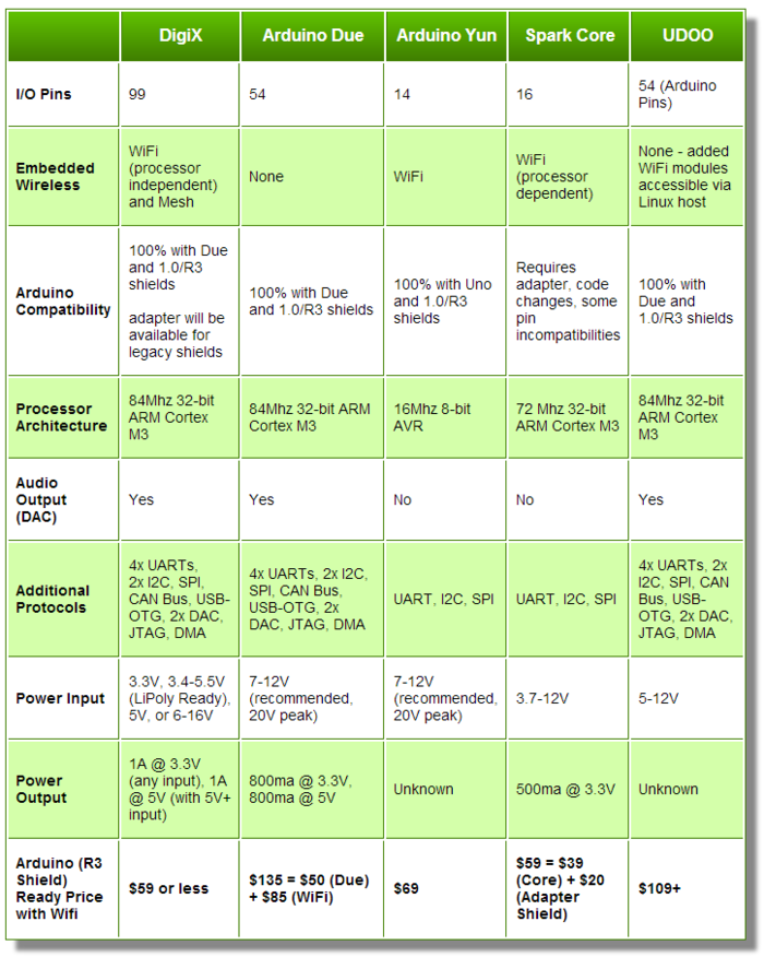 Com um formato físico compatível com o Arduino Due - e também compatível 100% a nível de software - este DigiX oferece inúmeras vantagens face aos concorrentes: temos um CPU de 32bits a 84MHz, WiFi (b/g/n) low power e também mesh networking, 99 pinos de I/O, USB, e... um preço altamente competitivo de apenas $59 dólares.