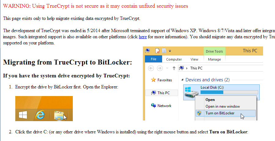 Más notícias para todos os que usavam ou recomendavam o Truecrypt como forma de manter os seus dados em segurança contra todas as eventualidades. O site apresenta agora um alerta de que o programa não é seguro, recomendando os utilizadores que passem a utilizar outros serviços, como o BitLocker para os utilizadores Windows.
