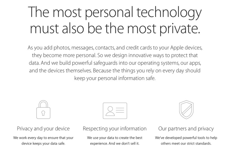 Com a questão da privacidade a estar cada vez mais no foco das atenções - a MS ainda agora veio tentar clarificar a recolha de dados que faz no Windows 10 - a Apple não deixa passar a oportunidade para se assumir como uma empresa que leva a privacidade dos seus utilizadores bem a sério.