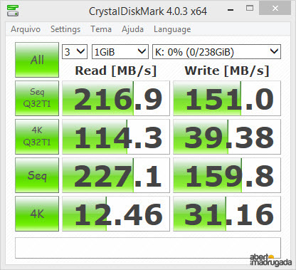 As velocidades não são comparáveis (30/34MB/s), mas servem apenas para mostrar que em caso de necessidade, podemos utilizar um outro cabo, mas de qualidade, para garantir a correcta alimentação da unidade.
