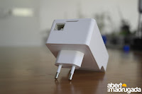Na parte inferior, temos a porta de rede e na traseira a ficha para ligar à tomada. Seria interessante que o repetidor utilizasse uma tomada "passthrough" para permitir ligar outros equipamentos à mesma tomada onde o primeiro se encontra ligado.
