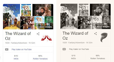 Para celebrar o 80º aniversário do clássico "The Wizard of Oz", a Google criou um easter egg bem apropriado. Bastará pesquisar por Wizard of Oz e de seguida clicar nos sapatos vermelhos para se ser transportado por um tornado para um Google a preto e branco, que homenageia o filme que também começa a preto e branco, e que só se passa a ser a cores quando se chega à terra mágica de Oz.