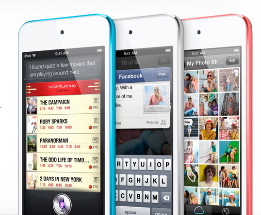 Para além do iPhone 5 e do novo iPod Nano, também o iPod Touch foi alvo de grande remodelação. O novo Touch cresce igualmente para um ecrã de 4" com 1136x640 pixeis, e leva a espessura a um novo ponto mínimo: apenas 6.1mm e 88g de peso. (Se acho ridículo andar a discutir-se coisas entre 7 ou 8 ou 9mm, admito que com algo a aproximar-se dos 5mm ou menos... será algo verdadeiramente espectacular, pelo menos dum ponto de vista técnico e de design. Quanto à sua real praticabilidade e usabilidade do dia a dia, ainda estará por ver a sua real vantagem - especialmente para quem valorizar a autonomia, imaginando quanto mais tempo poderia usar o seu equipamento sem se preocupar com fichas ou tomadas eléctricas, à custa de uns meros milímetros a mais).